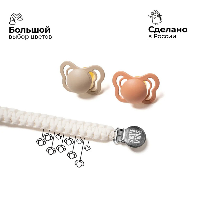 Держатели BUBA KIDS подходят абсолютно для всех видов пустышек – как с ручкой (BIBS Colour/Boheme/De Lux), так и без ручки (BIBS Couture/Supreme/Infinity). В комплекте c держателем есть силиконовое колечко, которое используется для крепления пустышки без ручки. Также держатели BUBA KIDS подходят для всех прорезывателей BIBS Baby Bitie, Mushie и прорезывателей Oli&Carol с отверстием для крепления.