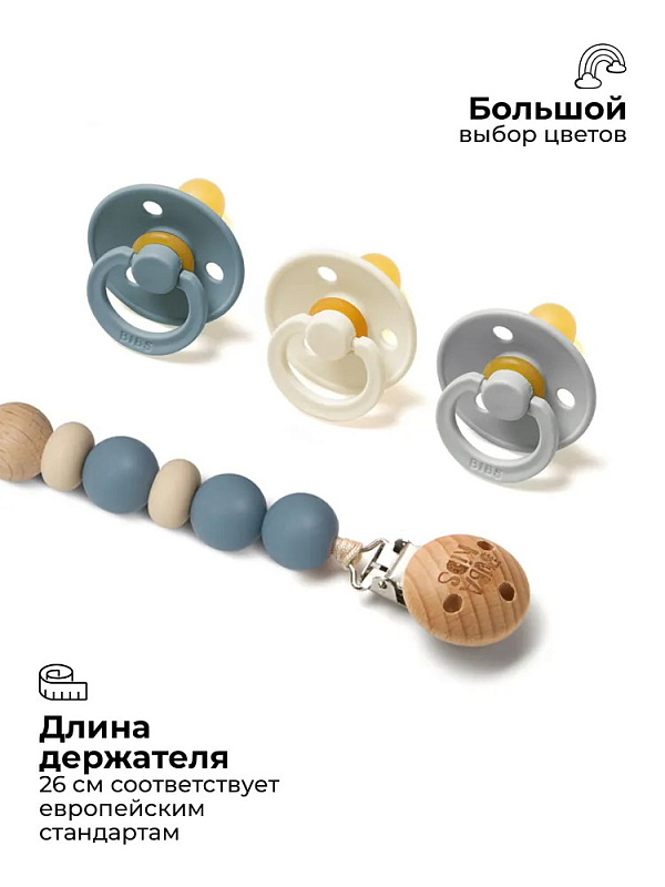 Держатель подходит для всех видов пустышек – как с ручкой (например, BIBS Colour/Boheme/DeLux), так и без ручки (BIBS Couture/Supreme/Infinity). В комплекте c держателем есть силиконовое колечко, которое используется для крепления пустышки без ручки.