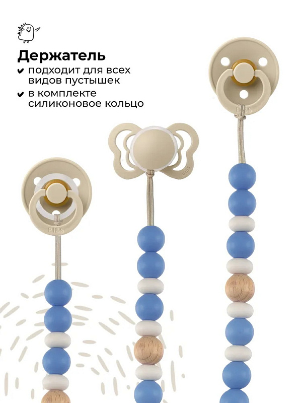 Держатель подходит для всех видов пустышек – как с ручкой (например, BIBS Colour/Boheme/DeLux), так и без ручки (BIBS Couture/Supreme/Infinity). В комплекте c держателем есть силиконовое колечко, которое используется для крепления пустышки без ручки.