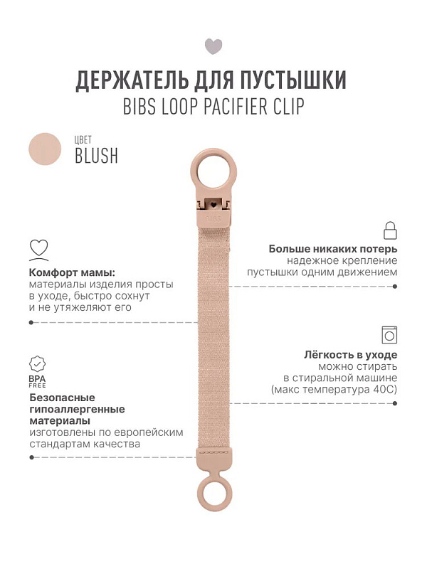 - Держатель очень прост в использовании: прикрепите клипсу к одежде малыша, и пустышка больше не потеряется и не упадет на пол. К нему можно подобрать пустышку BIBS с аналогичным принтом.