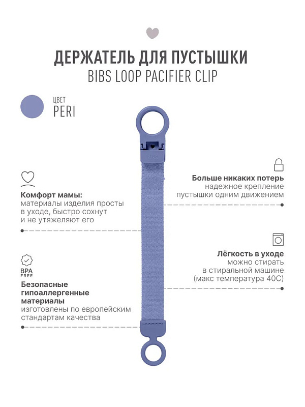 - Держатель очень прост в использовании: прикрепите клипсу к одежде малыша, и пустышка больше не потеряется и не упадет на пол. К нему можно подобрать пустышку BIBS с аналогичным принтом.