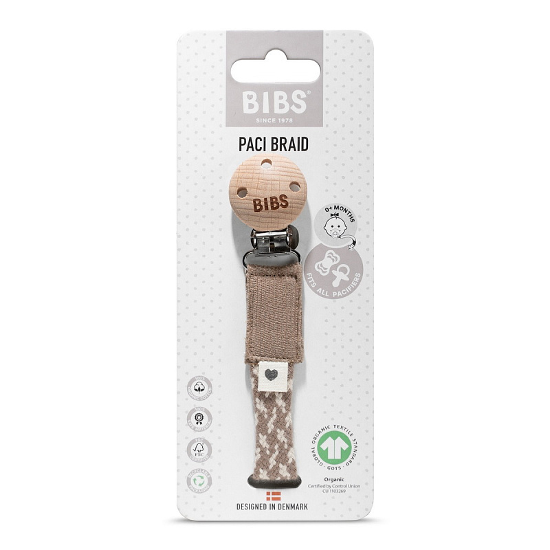Держатель BIBS выполнен из органического хлопка, металлическая клипса без никеля дополнена деревянным элементом. Длина соответствует стандартам безопасности.