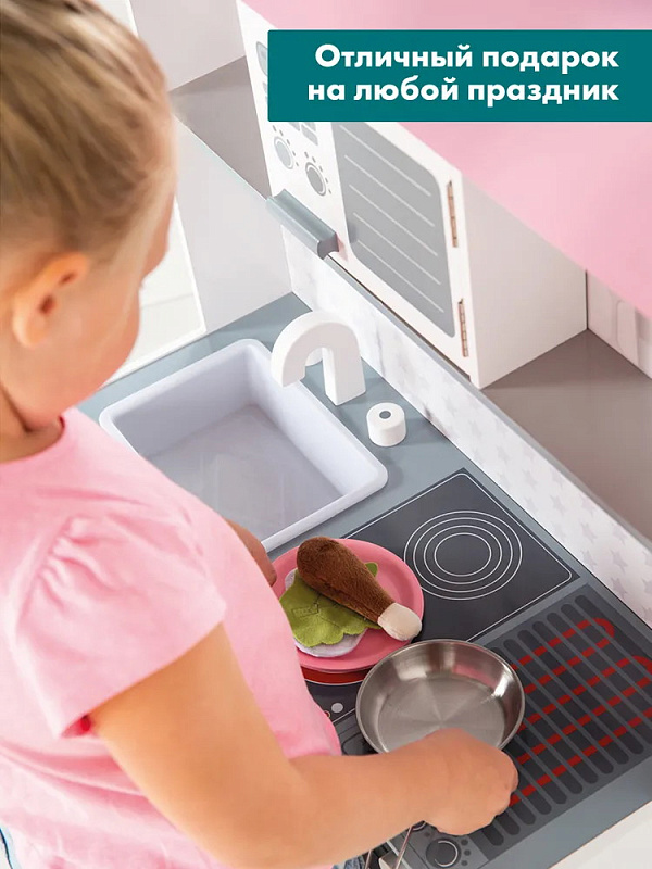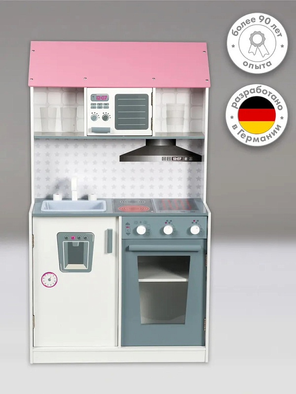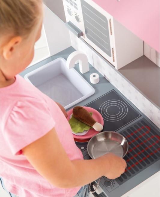 Детская кухонная зона оборудована холодильником, раковиной, краном, микроволновой печью, конфорками, плитой с вращающимися ручками и грилем.