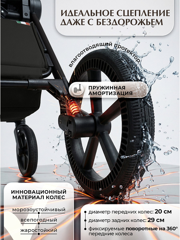 Увеличенные колеса из высокомолекулярного полимера, аналогичных тем, что используются в кроссовках Nike. Эти колеса гарантируют отличную амортизацию и сцепление с различными покрытиями, что делает каждую прогулку плавной и комфортной.