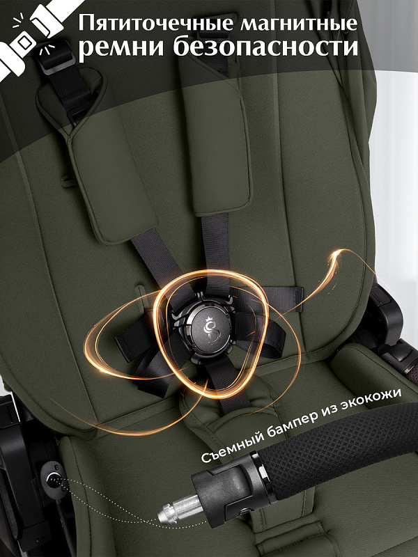 Регулируемые магнитные ремни безопасности с мягкими накладками и бампер из экокожи обеспечивают максимальную защиту и комфорт. Накидка с доступом к ребенку с молнией по центру защищает в прохладную погоду