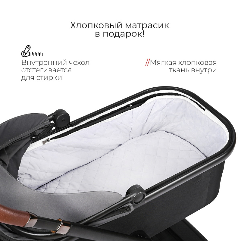 Комплект коляски включает люльку для новорожденного и прогулочный блок для детей от 6 мес до 3 лет.
