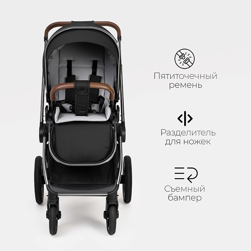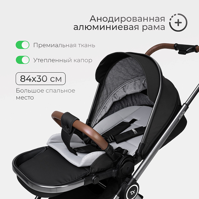 - Премиальная ткань используется для обивки коляски, обеспечивая мягкость и долговечность;