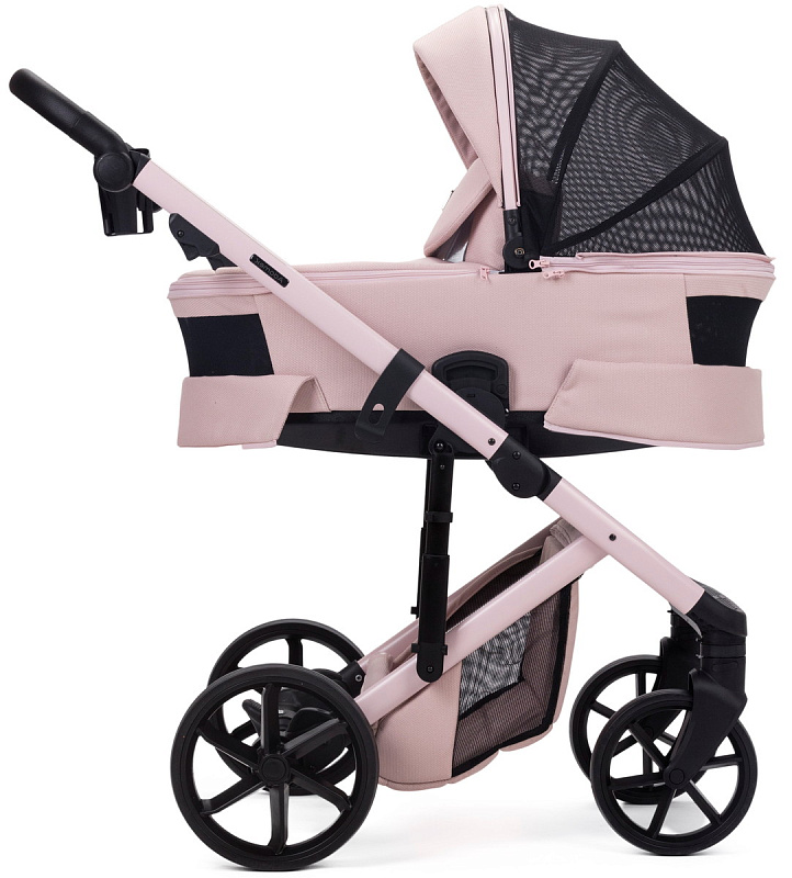 Просторная люлька отличается современным дизайном и оснащена механизмом быстрого складывания. Капюшон имеет съемную тканевую часть, под которой находится москитная сетка. Два вентиляционных окошка на молнии (спереди и сзади) обеспечивают отличную циркуляцию воздуха.