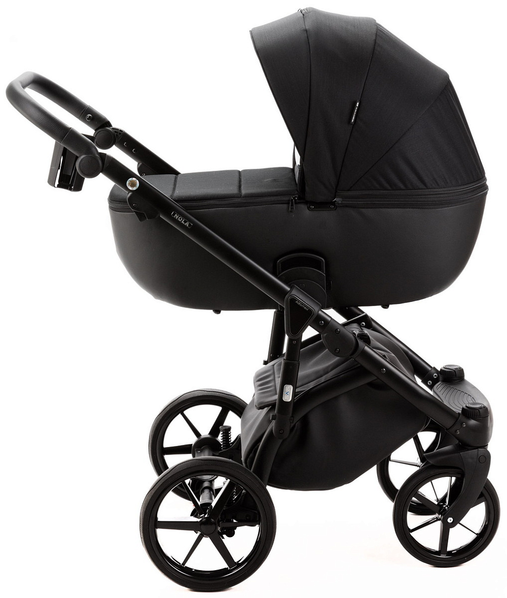 Корпус люльки пластиковый, обтянут эко-кожей. В донышко люльки встроено регулируемое вентиляционное окно. Люлька оборудована регулируемым по высоте подголовником, регуляция расположена с внешней стороны.Внутренняя обивка выполнена из хлопковой ткани.Люлька реверсивная, ее можно установить в положение «ребенок лицом к родителю», «ребенок лицом к направлению движения».Капюшон люльки 3-х сегментный капюшон с козырьком от солнца и дополнительным 4-м сегментом на молнии, под которым расположена анти-москитная сетка для проветривания. В капюшон встроена ручка для переноски люльки, ручка расположена под молнией.Накидка крепится к люльке с помощью молнии. Накидка оснащена откидным клапаном под клапаном расположено смотровое окно.