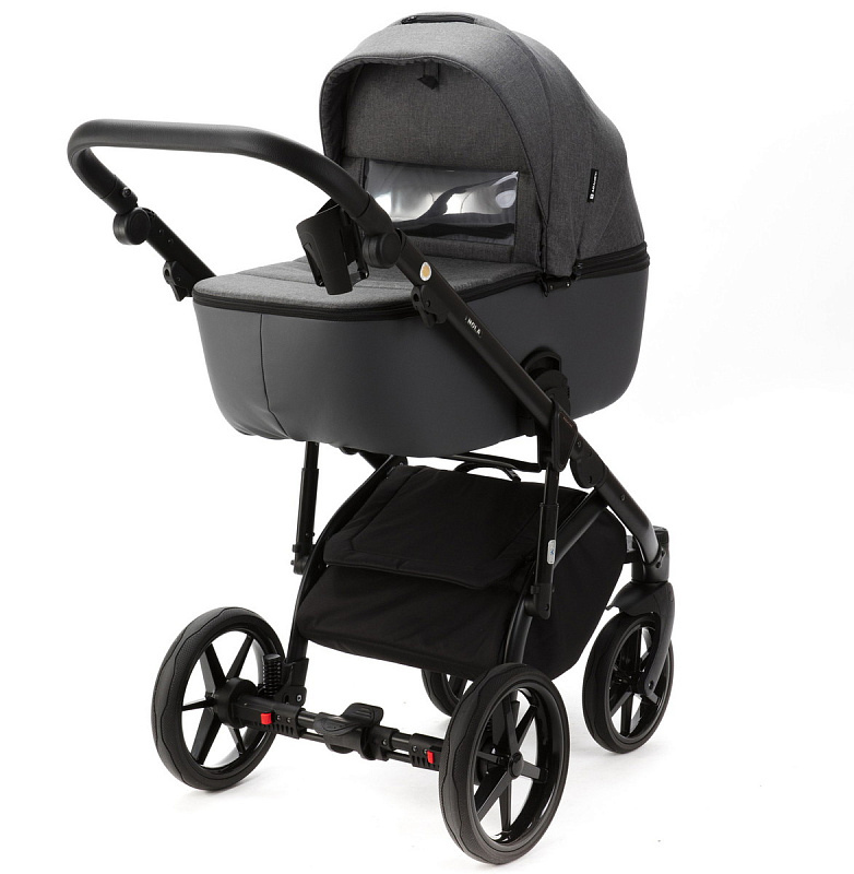 Корпус люльки пластиковый, обтянут эко-кожей. В донышко люльки встроено регулируемое вентиляционное окно. Люлька оборудована регулируемым по высоте подголовником, регуляция расположена с внешней стороны.Внутренняя обивка выполнена из хлопковой ткани.Люлька реверсивная, ее можно установить в положение «ребенок лицом к родителю», «ребенок лицом к направлению движения».Капюшон люльки 3-х сегментный капюшон с козырьком от солнца и дополнительным 4-м сегментом на молнии, под которым расположена анти-москитная сетка для проветривания. В капюшон встроена ручка для переноски люльки, ручка расположена под молнией.Накидка крепится к люльке с помощью молнии. Накидка оснащена откидным клапаном под клапаном расположено смотровое окно.