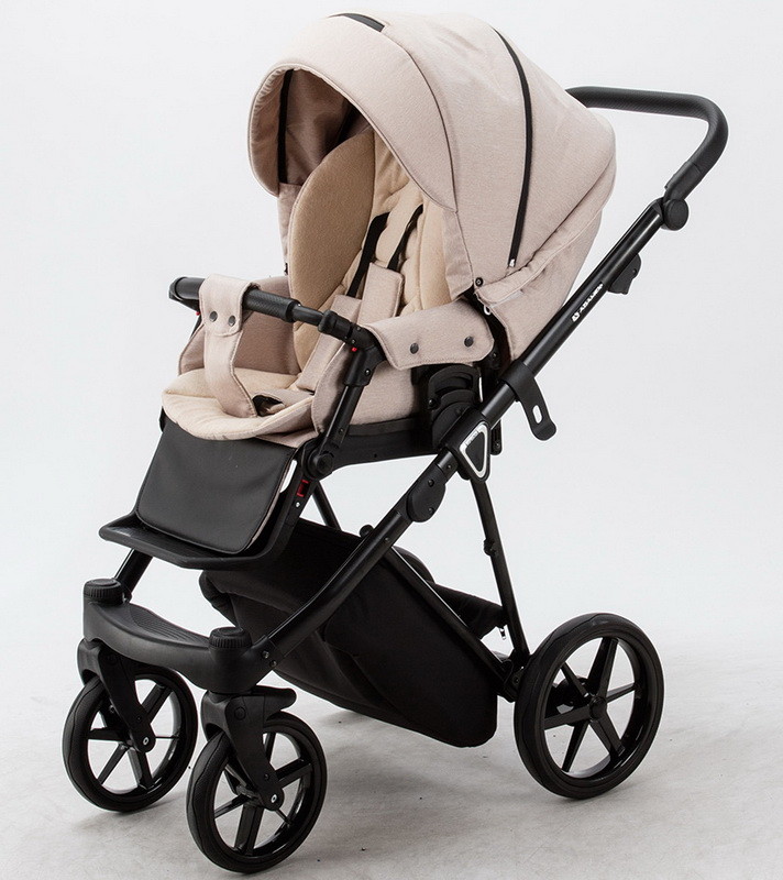 Детская коляска изготовлена из качественных материалов, верхнее покрытие из влагоотталкивающей ткани. В капюшоне предусмотрена сетка для проветривания. Эргономичный прогулочный блок оснащен удлиняющимся козырьком. Спинка сиденья регулируемая, с мягкими ремнями безопасности. Шасси оборудованы не прокалываемыми колесами с амортизаторами.