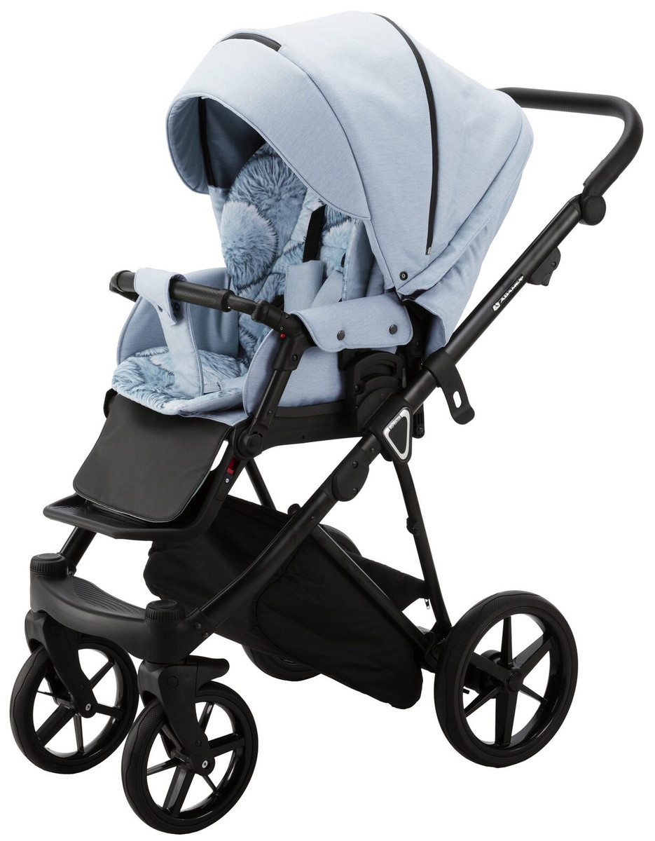 Детская коляска изготовлена из качественных материалов, верхнее покрытие из влагоотталкивающей ткани. В капюшоне предусмотрена сетка для проветривания. Эргономичный прогулочный блок оснащен удлиняющимся козырьком. Спинка сиденья регулируемая, с мягкими ремнями безопасности. Шасси оборудованы не прокалываемыми колесами с амортизаторами.