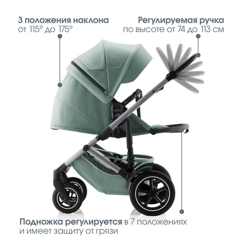 - Время поспать? Ваш малыш будет чувствовать себя комфортно благодаря регулируемой спинке, которую можно одним движением руки установить в вертикальное, наклонное или полностью горизонтальное положение. Когда сиденье приведено в полностью горизонтальное положение, регулируемая подножка обеспечит защиту ребёнка со всех сторон.