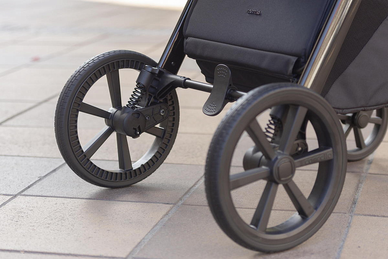 Рама коляски выполнена из алюминия, что делает ее легкой и устойчивой к воздействиям окружающей среды. Шлифованная обработка рамы придает ей эстетичный внешний вид. Амортизация на задней оси шасси имеет двухступенчатую регулировку, что обеспечивает удобство при передвижении по неровной местности. Антишоковая амортизация передних колес поглощает вибрации, смягчая удары при попадании колеса в ямку или препятствие. Адаптеры позволяют установить люльку на более высоком уровне. LED-фонарь с тремя режимами света (сильный, средний и проблесковый) обеспечивает безопасность в темное время суток. Коляска также может заряжаться через USB-порт.