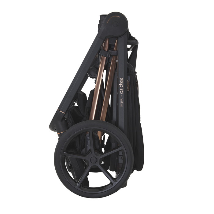 Мягкая амортизация на каждом колесе охраняет покой малыша. Она отлично гасит вибрацию от дороги, делая поездку плавной и спокойной. Большая вместительная корзина перевезет все ваши вещи! Она имеет отличный доступ со всех сторон и даже, когда ребенок спит и спинка сиденья опущена в горизонтальное положение. Тормоз расположен у правого колеса и выполнен в виде педали. Нажмите на ее нижнюю часть – колеса заблокируются. Нажмите на верхнюю – коляска может ехать. Вы сможете с легкостью сложить Espiro Miloo одной рукой вместе с прогулочным блоком. Благодаря продуманной конструкции в сложенном виде она не занимает много места. Шасси можно хранить в небольшой прихожей и без проблем положить в багажник автомобиля.