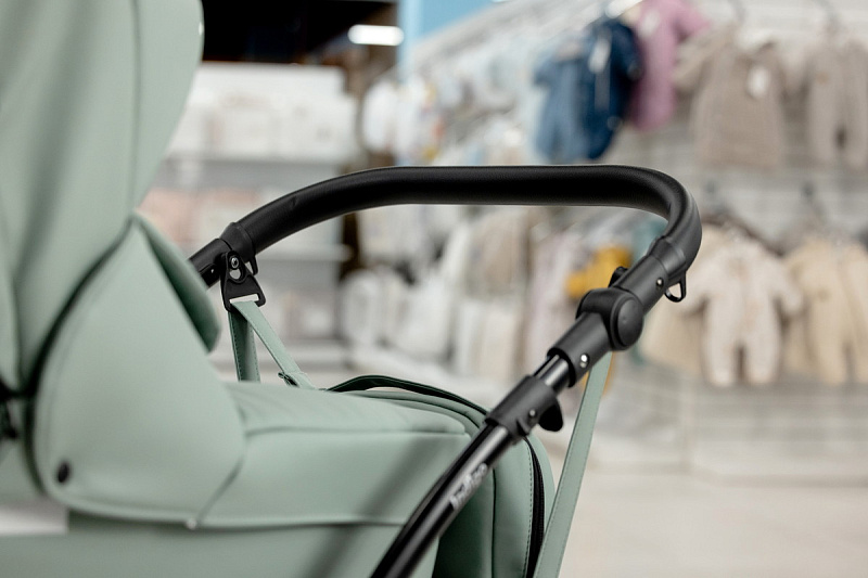 Регулируемая кожаная ручка легко подстраивается под рост родителя.