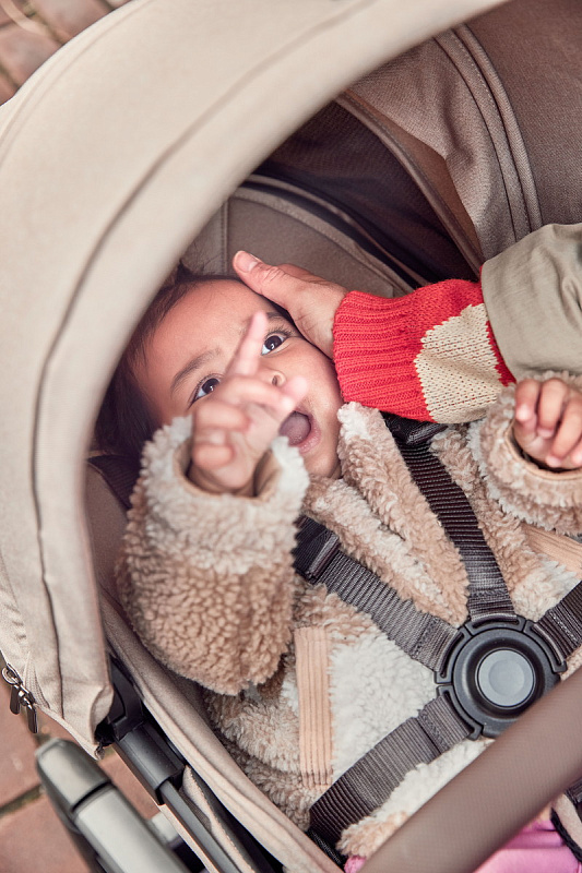 - Регулируемый большой капюшон (UPF50+) с сетчатой вставкой и петлями для игрушек