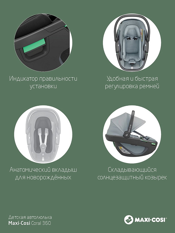 Автокресло Maxi-Cosi Coral 360 для новорождённых представляет собой инновационную модульную конструкцию и первое модульное детское автокресло с поворотом на 360 и сочетает в себе современные стандарты безопасности. Оно состоит из внешнего защитного кожуха, в котором фиксируется мягкая автолюлька-переноска. Переноска весит всего 1.7 кг, обеспечивая удобное использование. Для извлечения или защелкивания автолюльки в защитном кожухе требуется минимум усилий, а визуальные индикаторы подтверждают правильное и безопасное использование. Первое в своём роде автокресло такой конструкции разработано в соответствии с требованиями стандарта безопасности ECE 129/03 i-Size. Оно может устанавливаться как на базу Maxi-Cosi FamilyFix 360 с креплением isofix, так и самостоятельно, при помощи штатных ремней автомобиля. Это расширяет возможности использования модели в любом транспортном средстве.