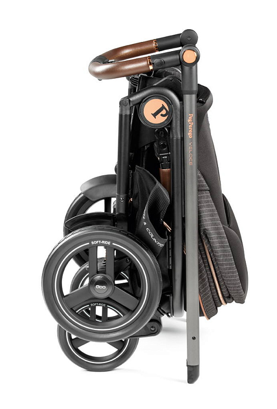 Прогулочная коляска Veloce TC складывается и раскладывается всего одной рукой с помощью специальной централизованной системы складывания, расположенной на ручке. В сложенном виде занимает очень мало места, и сама стоит без опоры, не пачкая ручку и тканевую обивку.