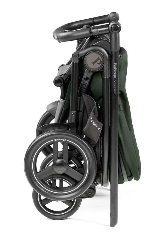 Прогулочная коляска Veloce TC складывается и раскладывается всего одной рукой с помощью специальной централизованной системы складывания, расположенной на ручке. В сложенном виде занимает очень мало места, и сама стоит без опоры, не пачкая ручку и тканевую обивку.