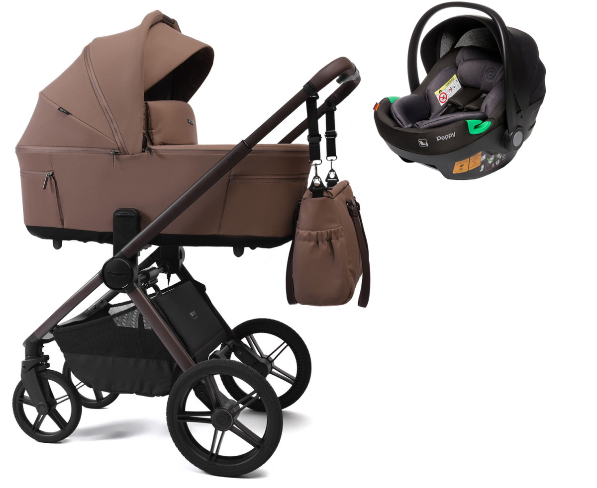 Детская коляска Peppy Soho 3 в 1 с автокреслом First Cappuccino (капучино) рама шоколад
