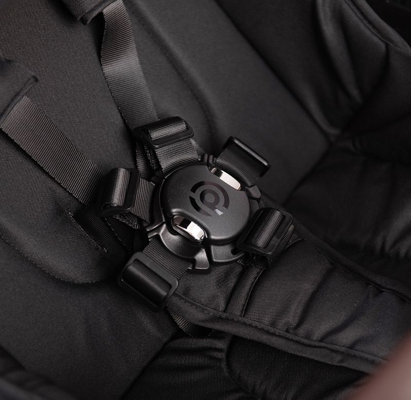 Защиту от выпадения малыша из коляски обеспечат пятиточечные ремни безопасности с современным магнитным замком, и бампер.