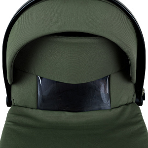 Капор люльки оборудован ручкой для переноски, имеется съемный козырек, дополнительная секция, климатическое окно под молнией в корпусе люльки и в капюшоне.