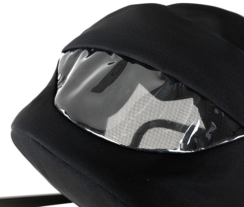 Капор люльки оборудован ручкой для переноски, имеется съемный козырек, дополнительная секция, климатическое окно под молнией в корпусе люльки и в капюшоне.