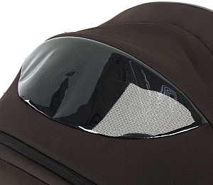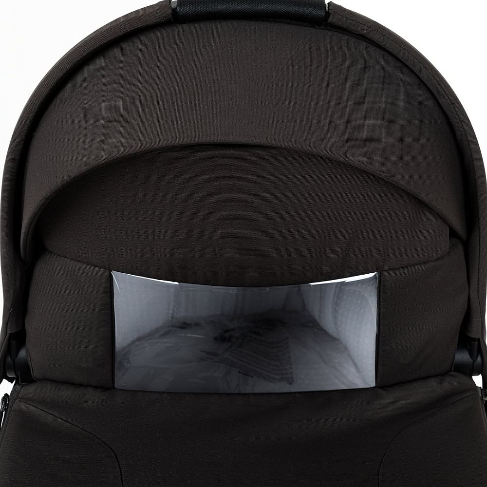 Капор люльки оборудован ручкой для переноски, имеется съемный козырек, дополнительная секция, климатическое окно под молнией в корпусе люльки и в капюшоне.