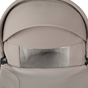 Капор люльки оборудован ручкой для переноски, имеется съемный козырек, дополнительная секция, климатическое окно под молнией в корпусе люльки и в капюшоне.