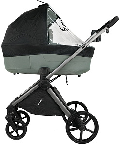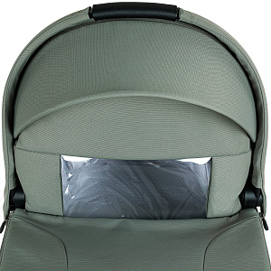 Капор люльки оборудован ручкой для переноски, имеется съемный козырек, дополнительная секция, климатическое окно под молнией в корпусе люльки и в капюшоне.