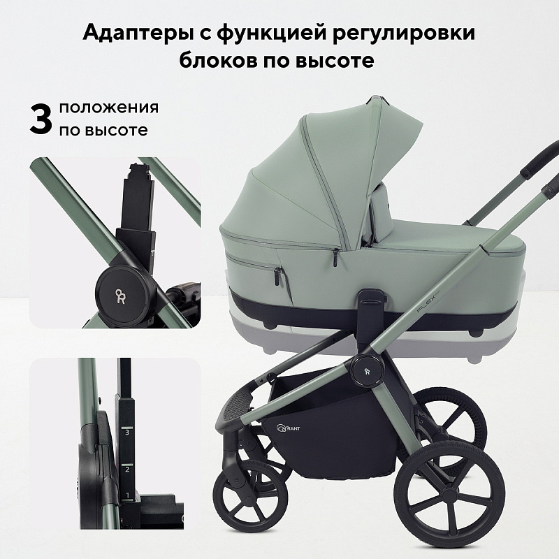 Модульность: в комплекте — люлька для новорождённого и прогулочный блок. Оба блока легко снимаются и устанавливаются. На раму возможно установить автокресло группы 0+ (адаптация без лишних усилий), что делает поездки более удобными и безопасными.