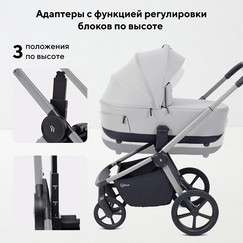 Модульность: в комплекте — люлька для новорождённого и прогулочный блок. Оба блока легко снимаются и устанавливаются. На раму возможно установить автокресло группы 0+ (адаптация без лишних усилий), что делает поездки более удобными и безопасными.