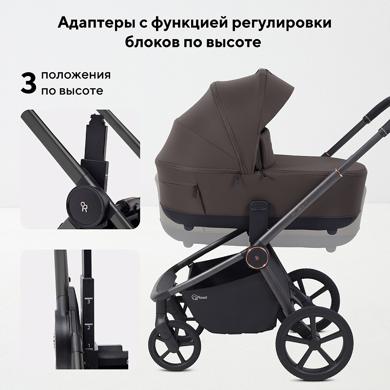 Модульность: в комплекте — люлька для новорождённого и прогулочный блок. Оба блока легко снимаются и устанавливаются. На раму возможно установить автокресло группы 0+ (адаптация без лишних усилий), что делает поездки более удобными и безопасными.