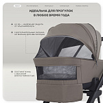 богатая комплектация: дождевик, москитная сетка, стильный рюкзак для мамы, который можно закрепить на ручке коляски