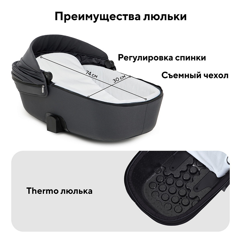 термолюлька литая. Особый материал, из которого выполнен блок, идеально поддерживает микроклимат внутри: на улице жарко - в люльке прохладно, на улице холодно - в люльке тепло. В то же время высокотехнологичный материал люльки характеризуется небольшим весом и ударопрочностью.