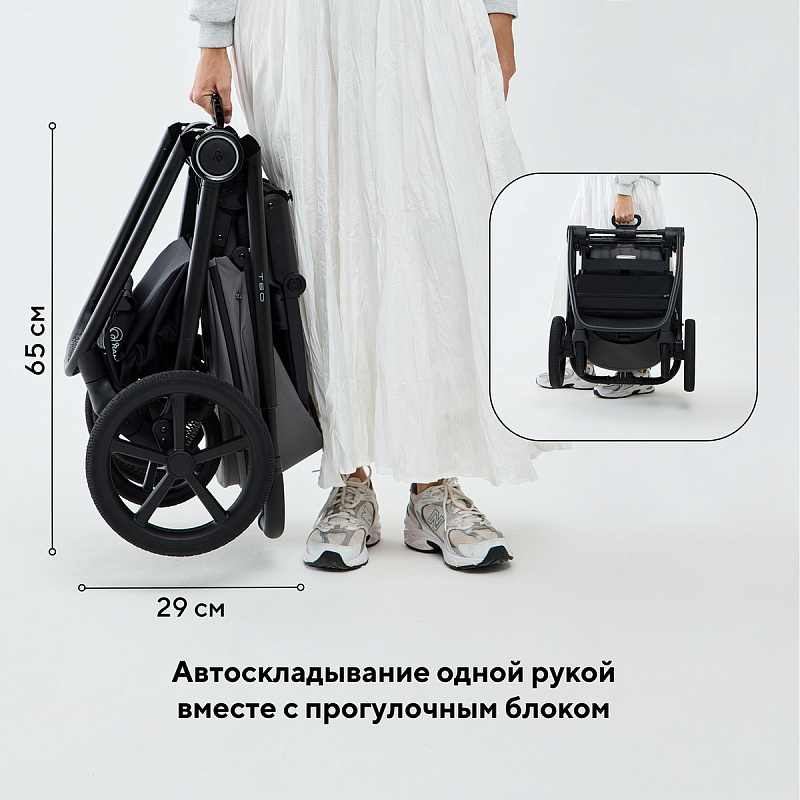коляска дополнена функцией автоскладывания - просто нажмите кнопку и слегка подтолкните подножку в обратную сторону. Модель складывается автоматически сразу вместе с блоком, независимо от его положения (по ходу/против хода).