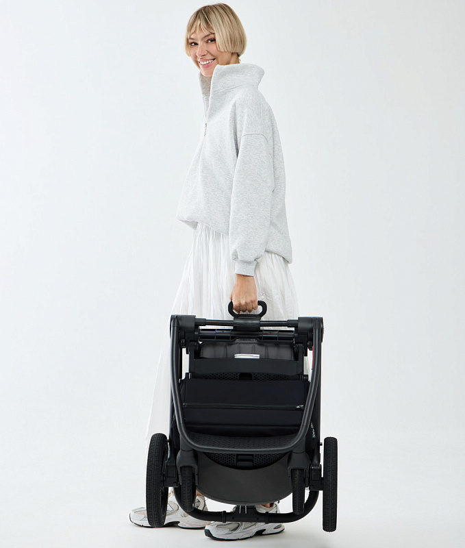 коляска дополнена функцией автоскладывания - просто нажмите кнопку и слегка подтолкните подножку в обратную сторону. Модель складывается автоматически сразу вместе с блоком, независимо от его положения (по ходу/против хода).