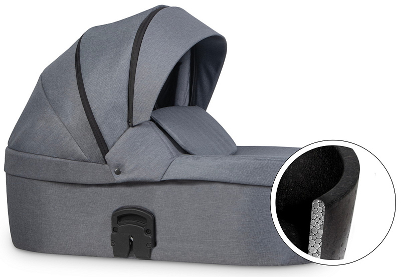 инновационная особенность модели - ультралегкая термолюлька, выполненная из материала Piocelan. Этот наноматериал - нетоксичный, легкий, высокопрочный, противоударный. Но главное, такая люлька поддерживает температуру и защищает кроху от громких звуков. Морозной зимой в люльке будет тепло и сухо, а в летний зной - прохладно.