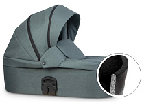 инновационная особенность модели - ультралегкая термолюлька, выполненная из материала Piocelan. Этот наноматериал - нетоксичный, легкий, высокопрочный, противоударный. Но главное, такая люлька поддерживает температуру и защищает кроху от громких звуков. Морозной зимой в люльке будет тепло и сухо, а в летний зной - прохладно.