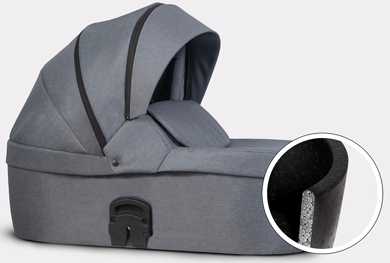 инновационная особенность модели - ультралегкая термолюлька, выполненная из материала Piocelan. Этот наноматериал - нетоксичный, легкий, высокопрочный, противоударный. Но главное, такая люлька поддерживает температуру и защищает кроху от громких звуков. Морозной зимой в люльке будет тепло и сухо, а в летний зной - прохладно.