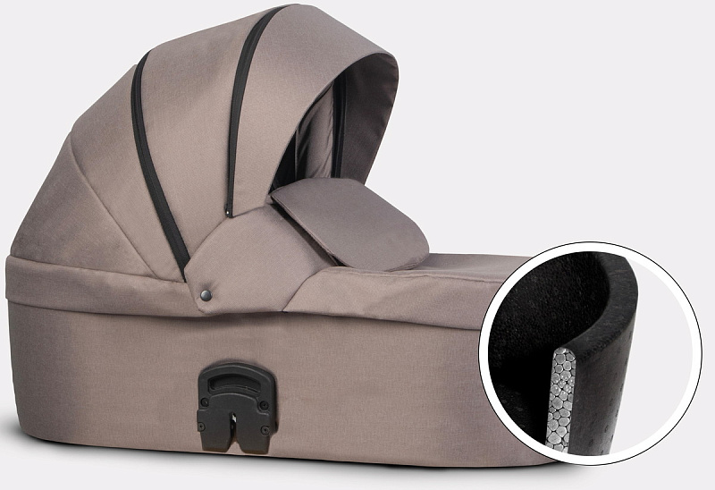 инновационная особенность модели - ультралегкая термолюлька, выполненная из материала Piocelan. Этот наноматериал - нетоксичный, легкий, высокопрочный, противоударный. Но главное, такая люлька поддерживает температуру и защищает кроху от громких звуков. Морозной зимой в люльке будет тепло и сухо, а в летний зной - прохладно.
