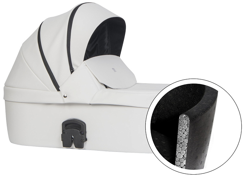 инновационная особенность модели - ультралегкая термолюлька, выполненная из материала Piocelan. Этот наноматериал - нетоксичный, легкий, высокопрочный, противоударный. Но главное, такая люлька поддерживает температуру и защищает кроху от громких звуков. Морозной зимой в люльке будет тепло и сухо, а в летний зной - прохладно.
