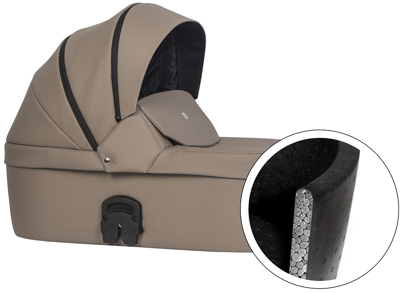 инновационная особенность модели - ультралегкая термолюлька, выполненная из материала Piocelan. Этот наноматериал - нетоксичный, легкий, высокопрочный, противоударный. Но главное, такая люлька поддерживает температуру и защищает кроху от громких звуков. Морозной зимой в люльке будет тепло и сухо, а в летний зной - прохладно.