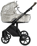 Накидка на люльку имеет дополнительный отворот со смотровым окном, сам отворот полностью закрывает ребенка от непогоды и крепится за счёт магнитов.