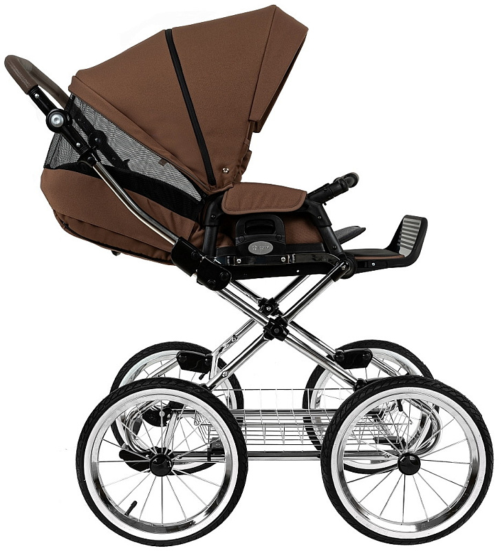 Главное достоинство такой рамы, что при движении по труднопроходимой местности колеса не вибрируют, коляска движется очень легко, а идеальная амортизация, основанная на кулисах, закрепленных в четырех точках, обеспечивает хороший сон для ребенка.