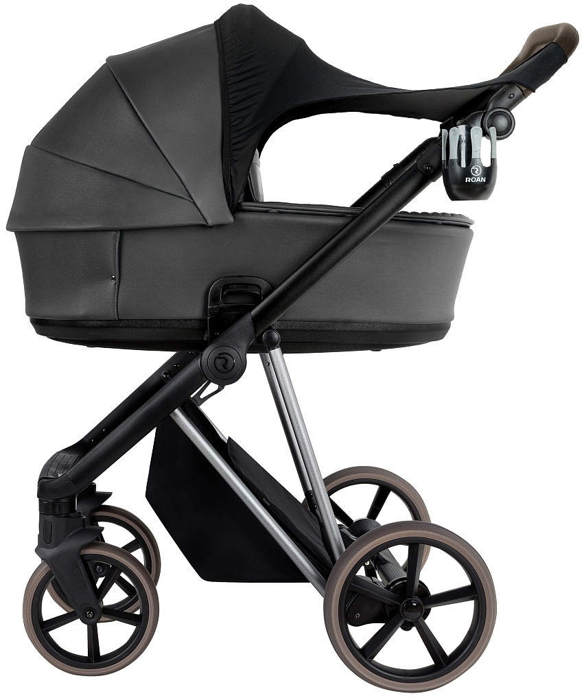 В конструкции рамы производитель Roan применяет собственные разработки деталей (узлов), например, тормозная система, механизм крепления люльки, механизм складывания и др. Это отличает данного производителя колясок от других фирм, которые используют универсальные узлы во всех колясках разных моделей.