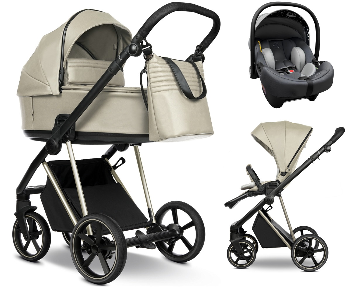 Детская коляска Roan Sol Vintage Luxury Leather 3 в 1 с автокреслом Tutis Elo Lux EduSky Grey VEGA11DB Almond Sugar /Champagne/руч.Champagne