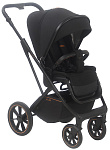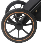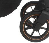 Коляска имеет алюминиевую раму с родительской ручкой, обшитой кожей. Бескамерные резиновые колеса хорошо амортизируются и не боятся острых предметов на дороге. Передние колеса поворотные с блокировкой, а задние колеса имеют увеличенный диаметр для повышенной проходимости.