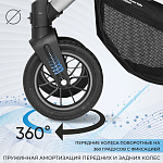 Надёжные резиновые колёса с амортизаторами и возможностью блокировки направления обеспечивают максимально гладкую поездку, а ручка, регулируемая по углу наклона, позволяет быстро настраивать положение сиденья.